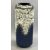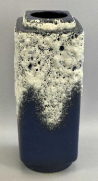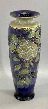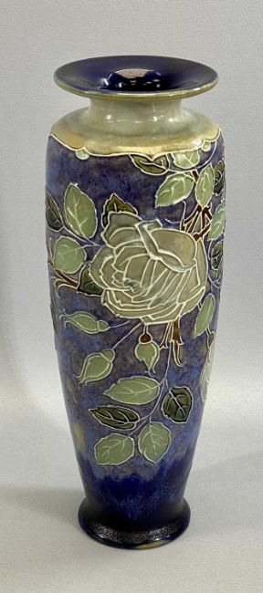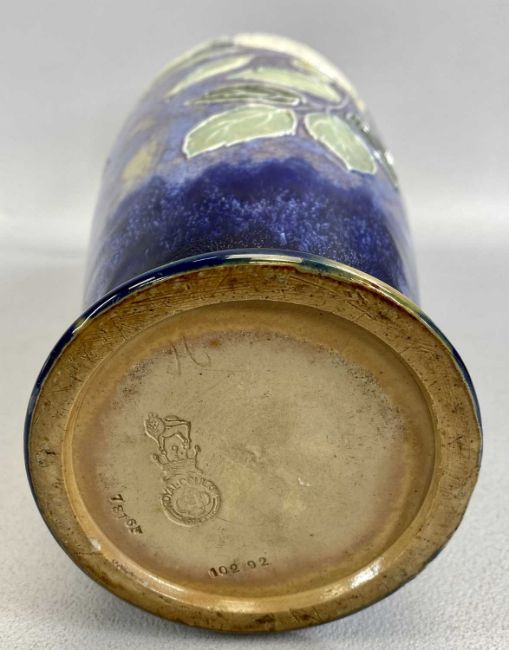 ROYAL DOULTON STONEWARE VASE - incised decoration of roses, on a mottled blue ground, 37cms H, impressed marks, a German Studio vase of square form, moulded pattern in blue and white, stamped 'Relief 84/36 Germany', 36cms H, a Grafton china muffin dish and cover, hand painted with flowers, white ground, 23cms diameter, two Carltonware leaf dishes, 21.5 x 19cms the largest and a pair of brown glazed terracotta figures of seated spaniels, 20cms H