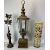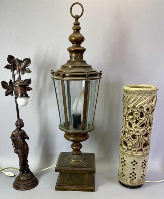 A RETRO WOODEN LANTERN STYLE TABLE LAMP with glass panels, 76cms H, a retro Studio Pottery table lamp, 46cms H, a figural metal table lamp decorated with leaves, 56cms H, ETC