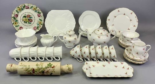 A SHELLEY DAINTY WHITE-GLAZED TEASET, 21 pieces, a 'Rosebud' part tea service, various makes, 39 pieces