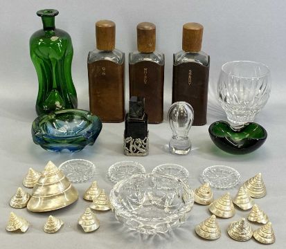 CIRCULAR CUT GLASS DECANTER WITH STOPPER, 35cms H and another with waisted circular body on star cut circular foot, 38cms H, a set of three glass candle holders, 20.5cms H, various other glassware, a collection of shells, ETC