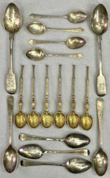 HALLMARKED SILVER SPOONS COLLECTION (14) and three other, believed continental teaspoons, to include a set of six silver gilt anointing teaspoons, Chester 1910, Maker H V Pithey & Co, 10cm lengths, two larger teaspoons, London 1822, Maker Thomas Streetin and 1824, Maker John William Blake, 4.25cm lengths, four small teaspoons, 1957/58 dates, four various assay office marks, all stamped 'Travis, Wilson & Co Ltd', maker's mark, 9cm lengths, two teaspoons with bright cut decoration to the handles, Sheffield 1908, Maker Hammond, Creake & Co, 12cm lengths, the final three believed to be early continental, and no marks, 11cm lengths, 4.9ozt the English, 5.6ozt gross