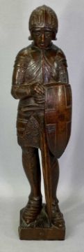 CARVED WOOD FIGURE OF A KNIGHT PRAYING - holding sword and shield, 19th century or earlier, 60cms H