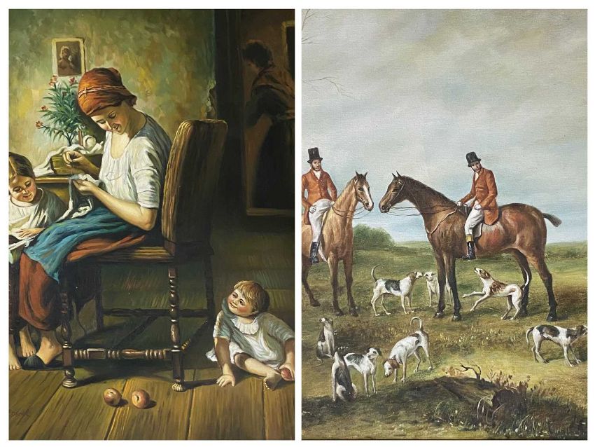 VAN GELDER Dutch School, 20th century oil on canvas - mother and children in interior setting, signed lower left, 59.5 x 49cms and an oil on canvas, British School 20th century - huntsman and hounds, unsigned, 49.5 x 59cms