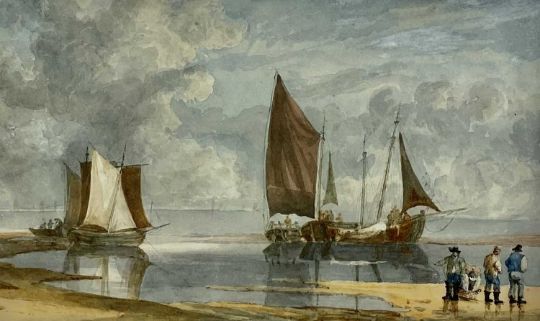 SAMUEL OWEN watercolour - boats and fishermen at the shore, unsigned, 25 x 40cms