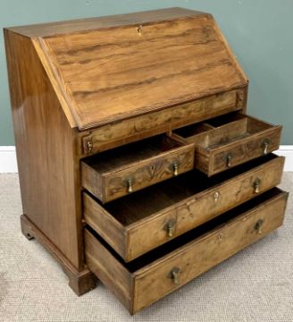 ANTIQUE CROSSBANDED WALNUT BUREAU - the fall front interior finely fitted with multiple drawers, tooled leather effect writing surface and slide open well, over two small and two long drawers with brass backplates and drop handles, ivory escutcheons to the lower long drawers, 98cms H, 93cms W, 54cms D(GOV.UK self-declaration form completed for the sale of this item - Submission reference K4W2Y4M5)
