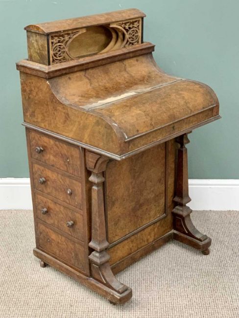 VICTORIAN BURR WALNUT DAVENPORT - with secret interior catch, pop up stationery holder having fancy interior fretwork panels, piano shape front lid opening to reveal a slide out gilt tooled leather work surface and ebonised ink holder over shaped front supports flanking a beaded central panel, four side opening drawers and opposing blind drawers, 102cms overall H including the pop up, 57cms max W, 52.3cms D