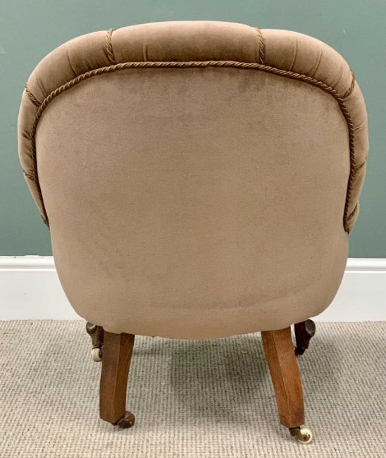 VICTORIAN EASY CHAIR - scallop back on scrolled supports and castors, 76cms H, 65cms W, 48cms D
