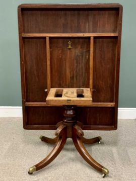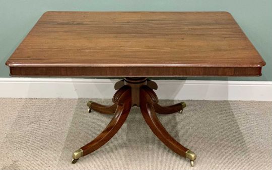 REGENCY MAHOGANY TILT TOP BREAKFAST TABLE - rectangular top on a bulbous turned column and four splayed supports with brass castors, 74cms H, 138cms W, 108cms D