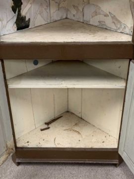 EARLY 19TH CENTURY PAINTED PINE TWO PIECE STANDING CORNER CUPBOARD - having twin 12 pane astragal glazed doors to the top with interior shelving on a two door cupboard base, 196cms overall H, 85cms across