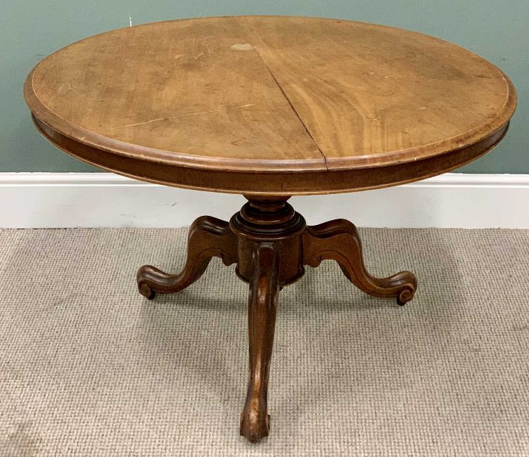VICTORIAN MAHOGANY BREAKFAST TABLE - circular tilt top on a turned column and tripod supports, 67cms H, 106cms diameter