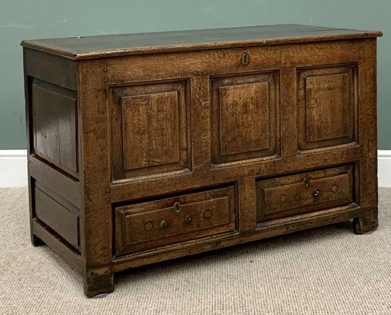 ANTIQUE OAK MUEL CHEST - with interior candle box and secret drawer compartment, peg joined construction having three chamfered panels to the front and twin chamfered lower drawers, panel sided on stile feet, 74cms H, 118.5cms W, 53cms D