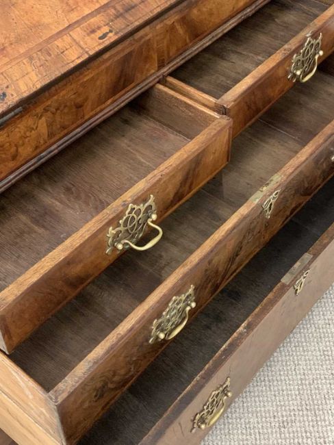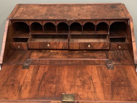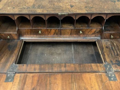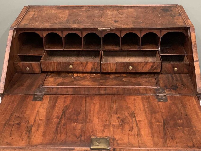 GEORGE IV WALNUT BUREAU - the fall front interior with pigeonholes and drawers above a slide open well, the base having two short over two long drawers, 91cms H, 101cms W, 68cms D