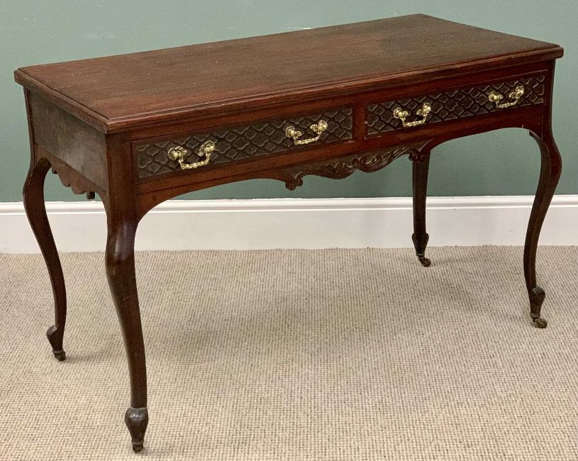 REPRODUCTION MAHOGANY DESK - having blind fretwork to the two frieze drawers on cabriole supports, 77cms H, 119cms W, 57cms D and a mahogany NARROW CHEST - 76cms H, 55cms W, 36cms D