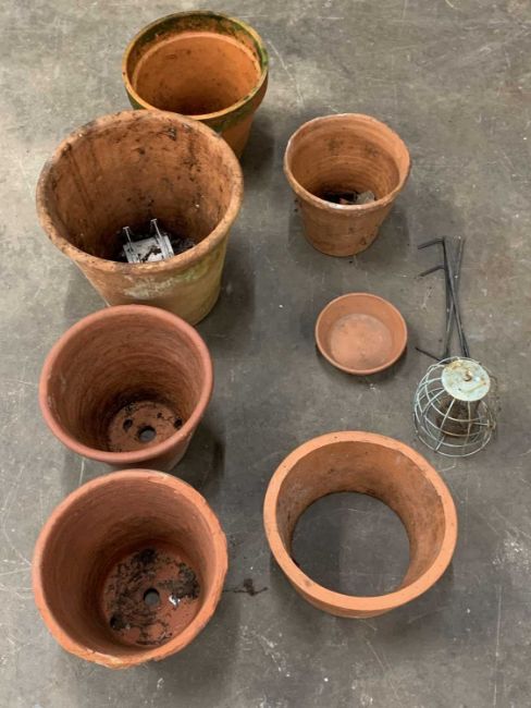 GARDEN WARE - an assortment of terracotta garden pots and a bird feeder