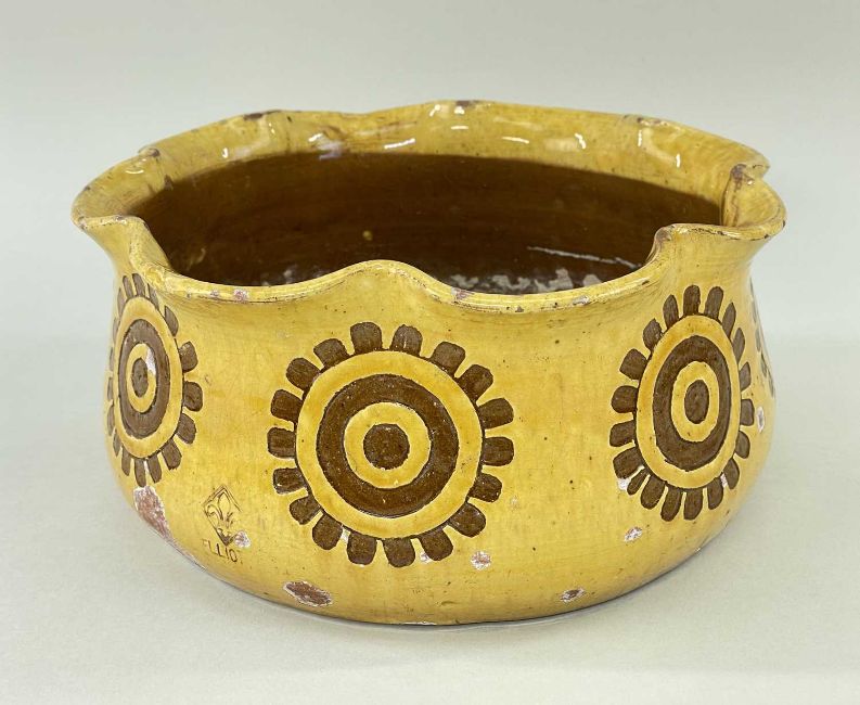 EWENNY SLIPWARE POTTERY DOG BOWL BY HORACE ELLIOTT yellow mustard glaze over white slip, crimped rim, sgraffito decoration of eight circular motifs, Elliott fleur-de-lys mark to body, and signed Horace Elliott London 1891 to the base, 24cms diam