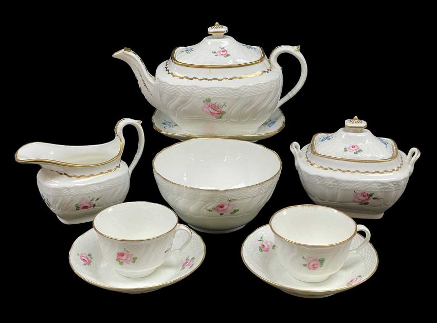 SWANSEA PORCELAIN PART TEA-SET circa 1815-1820, comprising teapot with stand and cover, sucrier and cover, cream jug, slop bowl and a pair of cups and saucers, all with wavy rim picked out in gold and embossed basket weave over elongated spiral moulded cartouches, painted with pink roses and anemone