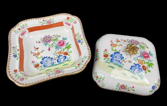 SWANSEA PORCELAIN FAMILLE ROSE PART DESSERT SERVICE circa 1814-1826, comprising circular based footed sauce tureen, cover and stand, square tureen and cover, platter and two plates, all with infill transfer pattern of of rose blooms and exotic flowers growing from rockwork, the decoration printed in black and then brightly coloured by hand, the cavetto in orange with gilded 'cracked ice' decoration, series of flower sprigs to border