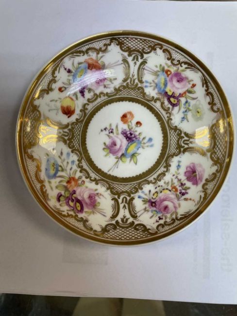 NANTGARW PORCELAIN TRIO circa 1818-1820, having elevated loop handles, painted with panels of flower sprays surrounded by gilt work of scrolls, stipple and lattice, saucer diam 13cms diam.
