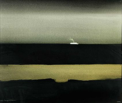‡ JOHN KNAPP-FISHER watercolour - view out to sea with a distant boat, entitled verso 'The Irish Ferry', signed and dated 1986 Dimensions: 38 x 43cmsProvenance:private collection Pembrokeshire, consigned via our Cardiff officeCondition Report:framed and glazed