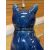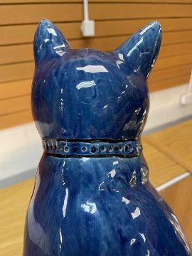 LARGE RARE EWENNY POTTERY SEATED CAT royal blue glaze, modelled with collar, sgraffito whiskers, ears and eyes, inscribed 'Morris' to chest and 'Gwae llygod - lle bo cath fawr', (woe to mice, where there is a big cat), base inscribed Jones Bridgend for Evan Jones, circa 1900