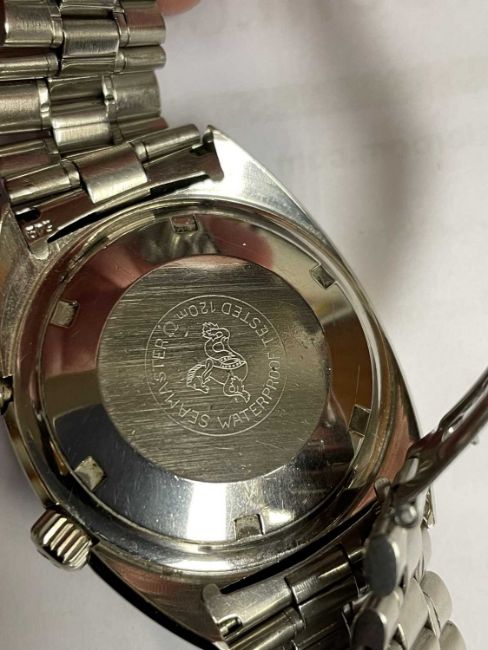 VINTAGE OMEGA SEAMASTER CHRONOSTOP CHRONOGRAPH WRISTWATCH, c. 1968, stainless steel, ref.145.007, cal.865 17J manual wind movement no.258***62, black dial with applied polished baton hour markers with luminous dot tips, outer racing minute divisions and raised tachymeter scale, white pointed baton hands with luminous inserts, orange centre chronograph hand, brushed and polished tonneau case, screw down back, winding crown at 4, chronograph button at 2, original steel bricklink bracelet with deployant clasp, case, dial and movement signed, with spare associated black leather strap with red stitching and steel buckle, original Omega Mexico Olympics box and guarantee booklet dated 1968, 40mm diam. Provenance:private collection South Wales, consigned via our Cardiff officeCondition Report:ticks when wound, chronograph hand not working, crown changes hands as normal, perspex scratched