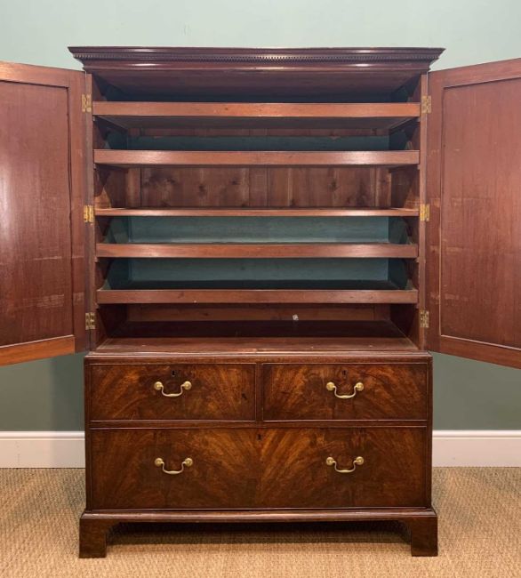 GEORGE III MAHOGANY LINEN PRESS, with dental cornice, above cupboard doors with caddy moulding, enclosing 4 slides, above 3 drawers, on bracket feet, 180.5cm h x 129.5cm w x 60cm dComments: original handles replaced, doors slightly warped, minor scuffs, one slide missing