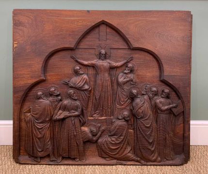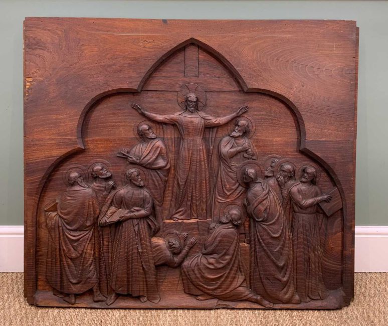 20TH CENTURY RELIEF CARVED OAK PANEL, depicting the resurrection of Christ with Apsostles, 89.5 h x 103 w cm