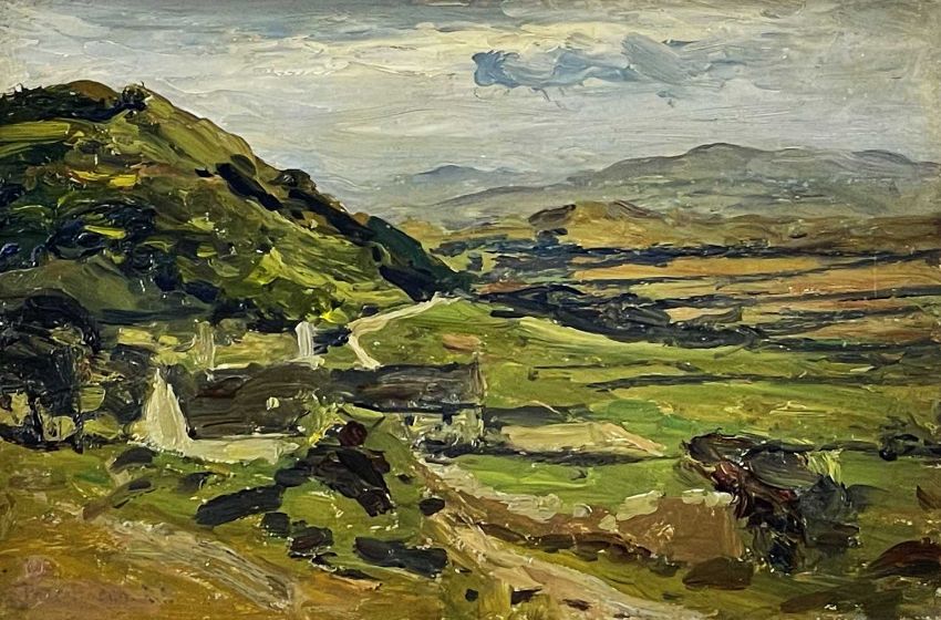 THOMAS HUSON oils on board - two views of north Wales, one entitled verso 'Seaweed and Rock', the other depicting a view across valley with cottages and distant mountains, both signed and inscribed verso and dated 1880, 15 x 23cms (2)