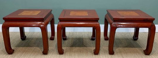 SET THREE CHINESE RED LACQUER SQUARE OCCASIONAL TABLES, inlaid woven rattan centres, incurved legs, 60cm h x 64.5cm w x 65.5 cm d (3)Comments: surface scratches, 1 table with large chip to top which has been reglued, minor chips to top and legs