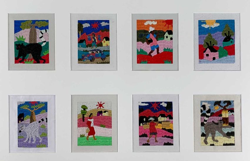 COLLECTION OF PICTURES TO INCLUDE, 2 x woolwork coloured panels, 2 x South African watercolour sketches, 2 x Indian inkwash sketches, two Mughal-style illustrated album pages, one depicting a prince on horseback being served by three maidens at a well, 23.5 x 16.5cms; another with a sultan and a group of courtiers on a terrace, 23 x 15cms, South African School watercolour coastal scene - waves breaking on rocks, signed L M 83, 34 x 49cms together with oil on card watering hole unsigned, 37 x 49cms and an oil on card Welsh cottage/coastal scene, unsigned, 49 x 36cmsProvenance: Estate of Prof. Ritchie Ovendale, Aberystwyth.Comments: woolwork panels, South African water sketches, Indian inkwash sketches unframed, Mughal style illustrated album pages on card mounts, first with marginal tears, edges torn, South African watercolour costal scene mounted but unframed
