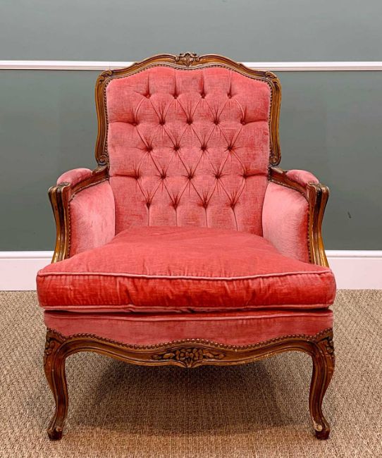 PAIR LOUIS XV-STYLE BERGERE ARMCHAIRS, moulded and carved rails, pink velour button-upholstered backs with loose cushions (2)