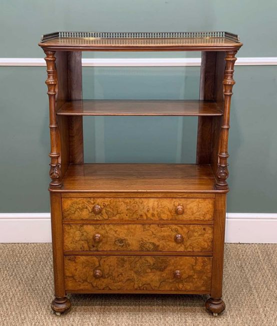 MID-VICTORIAN WALNUT & BURR WALNUT CHEST BASE WHATNOT, with gilt brass 3/4 gallery above open shelves, supported by turned and foliate carved columns, on compressed foliate feet, porcelain castors, 114 h x 73 w x 38cms d