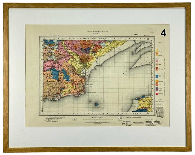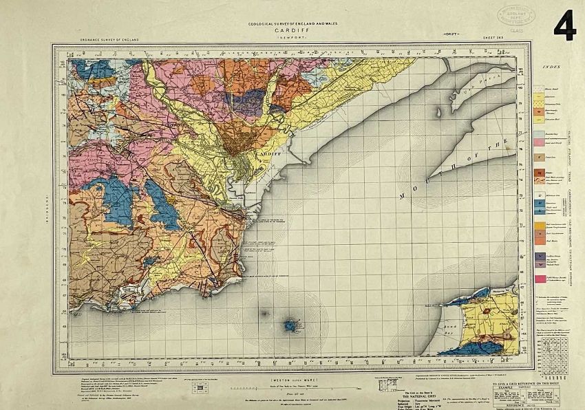 MID 20TH CENTURY GEOLOGICAL SURVEY ENGLAND & WALES (ORDNANCE SURVEY COLOURED MAP), Cardiff, Newport and the Bristol Channel, including Weston-Super-Mare, scale of 1 inch to 1 statute mile, with a Bedford College Geology Department stamp, 44 x 61cms