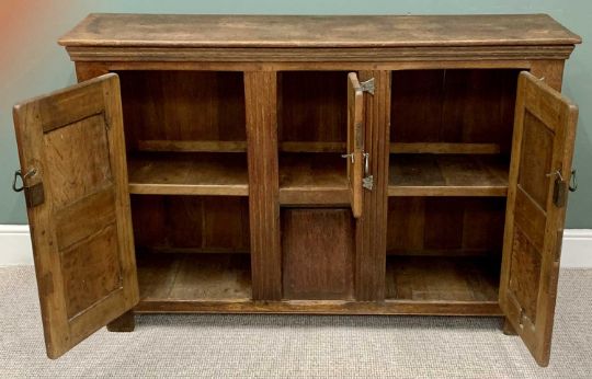 REPRODUCTION ANTIQUE OAK MULTI-DOOR CUPBOARD - with panelled front and rustic door furniture, 102cms H, 154cms W, 42cms D