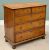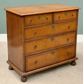 CROSSBANDED WALNUT CHEST OF DRAWERS - having two short over three long drawers with brass ring handles on turned bun feet, 91cms H, 97cms W, 52cms D