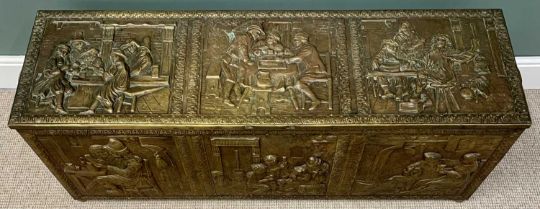 COAL/LOG BOX - large capacity, repousse brass with tavern scenes, 50cms H, 138cms W, 42cms D