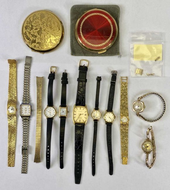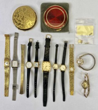 LADY'S WRISTWATCHES COLLECTION IN 9CT GOLD & OTHER METALS (10) and two vintage Stratton face powder compacts, the 9ct by Rotary, square cased, 20 x 20mm, the dial set with Arabic numerals and subsidiary seconds dial on a base metal bracelet, three gold plated wristwatches, two having integral straps, a bi-colour stainless steel and five others having black leather straps, various makers including a further Rotary, Accurist, Sekonda and others