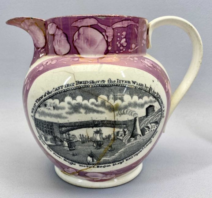 A SUNDERLAND LUSTRE WARE RECTANGULAR WALL PLAQUE - late 19th century, transfer decorated to the centre with a three masted British sailing ship and cartouche containing script 'May Peace and Plenty on our Nation Smile, Trade and Commerce, Bless the British Isle', reverse with impressed mark, 19 x 21cms and a Sunderland lustre ware jug 'The Sailor's Farewell', 16cms H