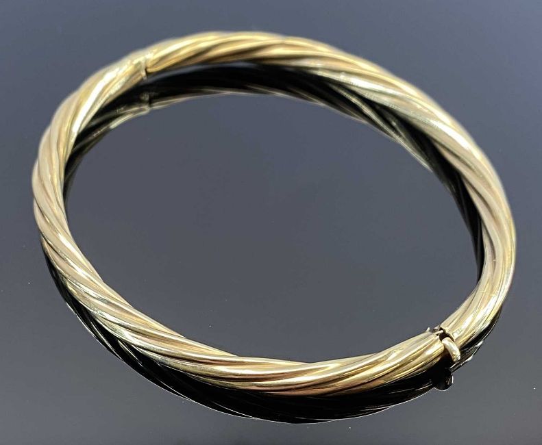 9CT GOLD HOLLOW CORE ROPE TWIST BANGLE - stamped '375' to the clip, 7cms approx diameter, 9.6grms