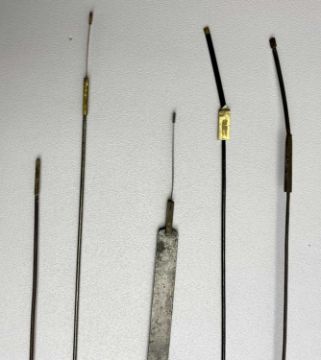 LONGCASE CLOCK PENDULUMS (5) - with lead filled bobs, a cast metal clock bell, 10.5cms diameter and three gilded brass clock finials