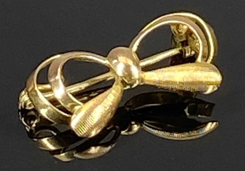 9CT GOLD BROOCHES (3) - to include a garnet set bar brooch, 5cms, garnet and seed pearl set bar brooch, 5cms, and a small ribbon bow brooch, 2.75cms, 6.5grms gross