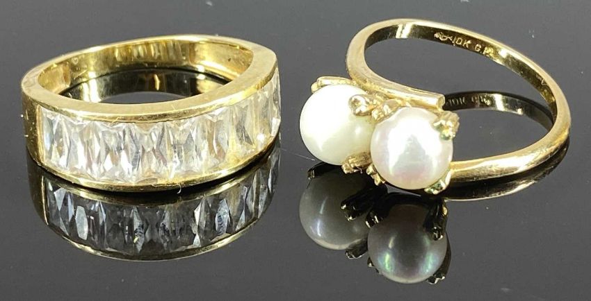 VARIOUS GOLD/YELLOW METAL RINGS (4) - one set with baguette cut pastes stamped '750 A1', Size S, 4.7grms, textured wide banding between raised edge example stamped '750 A1', Size Mid S-T, 2.4grms, crossover pattern ring, claw mounted with two pearls stamped '10k G.F.', Size Mid P-Q, 3grms, the final ring wide banded having a star cut pattern set with four small pastes, minor trace marks apparent only, Size R, 4.4grms