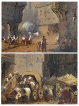 UNSIGNED WATERCOLOURS (2) - Georgian street scenes, including people, carts and wagons, 28 x 21cms the largest