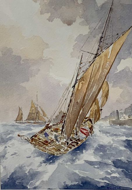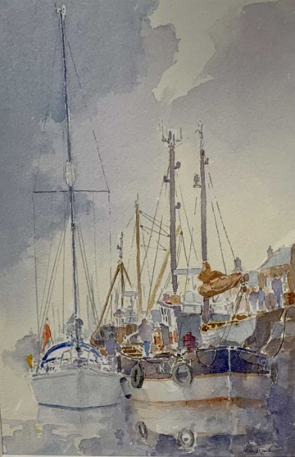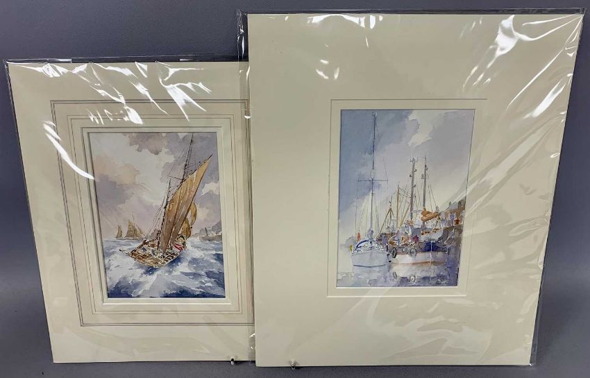 ALAN STARK watercolours (2) - sailing ships moored at harbour, signed lower right, 23 x 15.5cms and - sailing boat off shore, signed lower right, 22 x 15.5cms