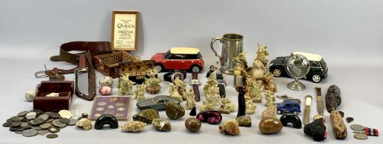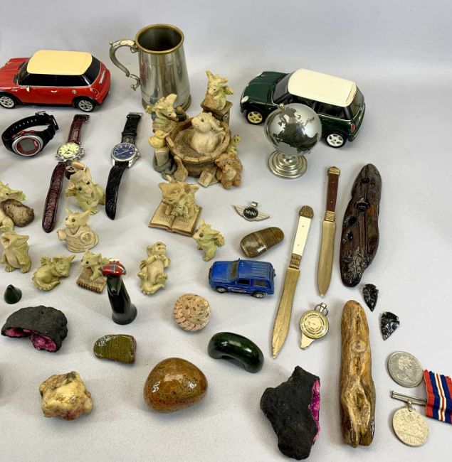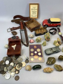 VARIETY OF MIXED COLLECTABLES including a Bulova Precisionist gent's wristwatch, a Stauer gent's wristwatch, a Bowie type sheath knife with 16.5cms blade and leather sheath, small collection of pre-decimal and other coins, polished hard stone and crystal samples, pocket dragons collection, ETC