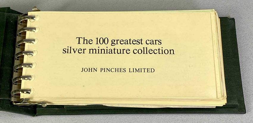 JOHN PINCHES CASED SET OF MINIATURE SILVER INGOTS - 100 Greatest Cars Collection, in a fitted green case along with original information card folder dated 1975