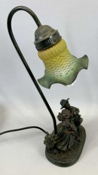 MANTEL CLOCK - in four pillar case, skeleton movement, striking on a bell, 29cms H, 24cms W, 13cms D and an Art Nouveau style composite figural table lamp with moulded glass shade, 44cms H
