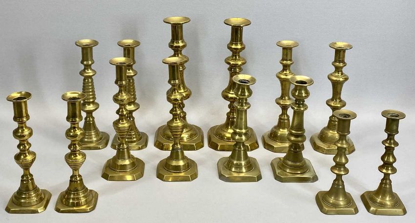 VICTORIAN BRASS CANDLESTICKS, 8 PAIRS - with octagonal bases and knopped columns, 30.5cms H the tallest