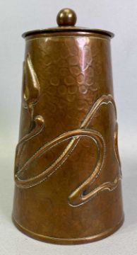 ARTS & CRAFTS COPPER LIDDED CONTAINER - possibly Newlyn School, of tapered, cylindrical form and embossed with stylised floral motifs, the cover with ball finial, 20cms H