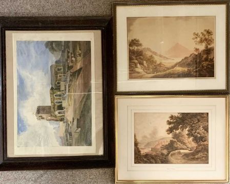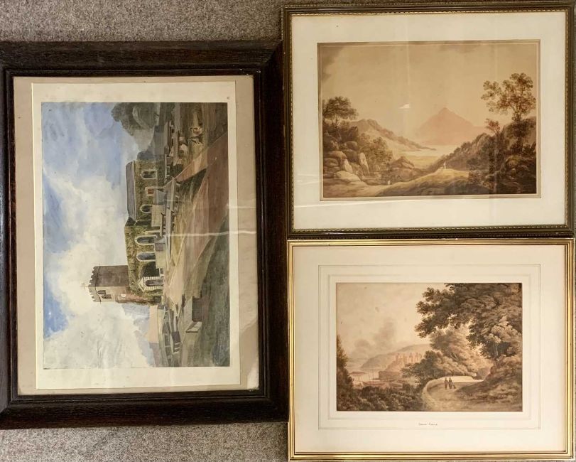 Early 19th century watercolours (3) – Georgian style church and graveyard with figures, 37 x 53cms, Loch Kintyre, 31 x 44cms and Conway Castle, 26 x 37cms
